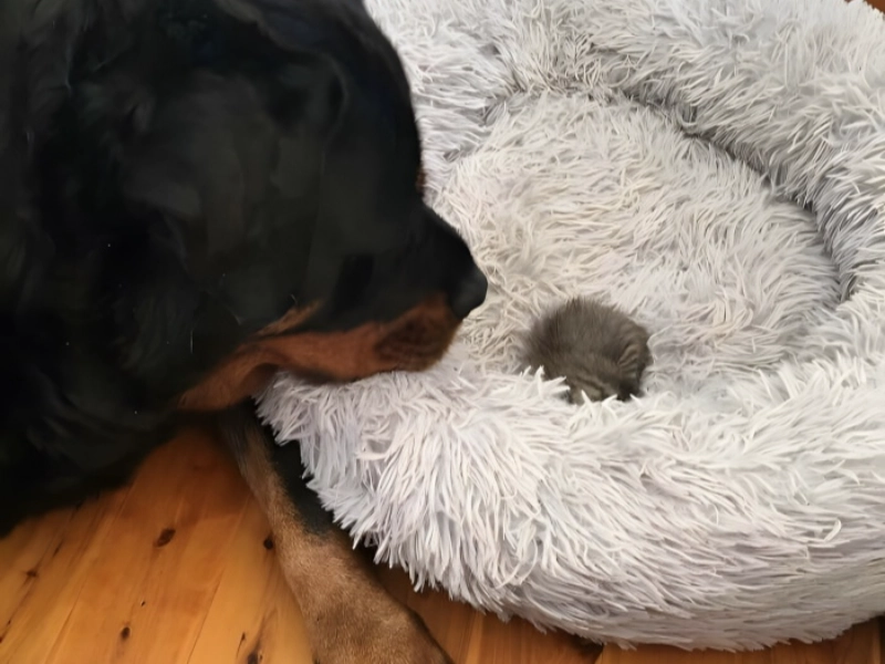 Großen Hunderassen – insbesondere Rottweilern – haften oft falsche Vorurteile an, die ihren wirklich sanften und fürsorglichen Charakter überschatten können. Dieses bewegende Bild ist ein großartiges Zeugnis für die fürsorgliche Seele, die in manchen zu Unrecht stigmatisierten Hunden schlummert. Als dieser Rottweiler ein hilfloses Streunerkätzchen sah, war seine natürliche Reaktion nicht Gleichgültigkeit oder Feindseligkeit, sondern ein schnelles Aufblitzen von Beschützerinstinkt und zarter Fürsorge. Das Bild zeigt stundenlange konzentrierte Aufmerksamkeit, während der große Hund eine schützende Haltung um seinen kleinen neuen Freund einnimmt und so eine sichere Umgebung schafft, in der das verängstigte Kätzchen zur Ruhe kommen kann. Dieses Verhalten ist nicht nur niedlich, sondern auch ein großartiges Beispiel dafür, wie oft Vorurteile bezüglich Größe und Rasse versagen, den wahren Charakter dieser erstaunlichen Tiere zu erfassen. Die Interaktion zwischen diesem ungewöhnlichen Paar lässt auch eine interessante zukünftige Beziehung erahnen, denn Katzen übernehmen in gemischten Haushalten häufig Führungspositionen, ungeachtet des Größenunterschieds. Dieser liebevolle Moment tierartenübergreifender Fürsorge und Schutz erinnert uns daran, dass das Potenzial für Zärtlichkeit manchmal in unerwarteter Verpackung daherkommt und hilft, Vorannahmen in Frage zu stellen.