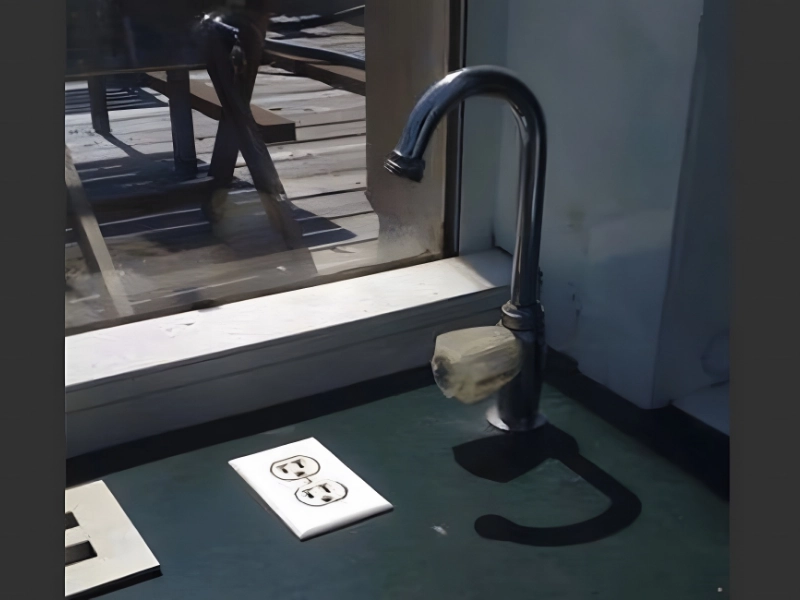 Zweitens gibt es nur einen stromführenden Stecker und kein Waschbecken, um überschüssiges Wasser aufzufangen. Die Probleme hier sind zahlreicher, als wir auflisten könnten, aber fangen wir mit dem offensichtlichsten an. Wer es wagt, diesen Hahn aufzudrehen, bucht sich eine Einzelfahrt in die Notaufnahme.
