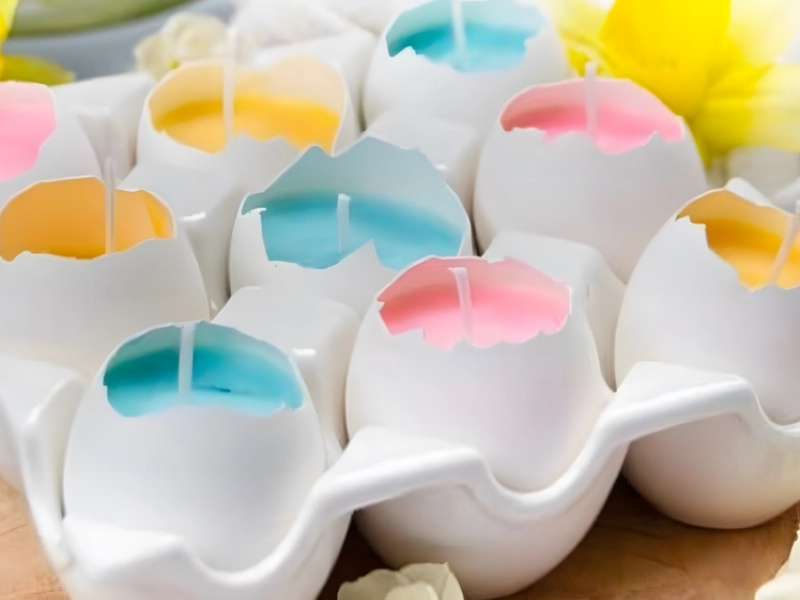 Diese Technik funktioniert am besten mit großen Eiern. Die Schalen müssen vollständig ausgekocht und getrocknet sein, bevor Wachs und Docht eingefüllt werden. Für einen festlichen Look können die Schalen vorher bemalt oder eingefärbt werden.