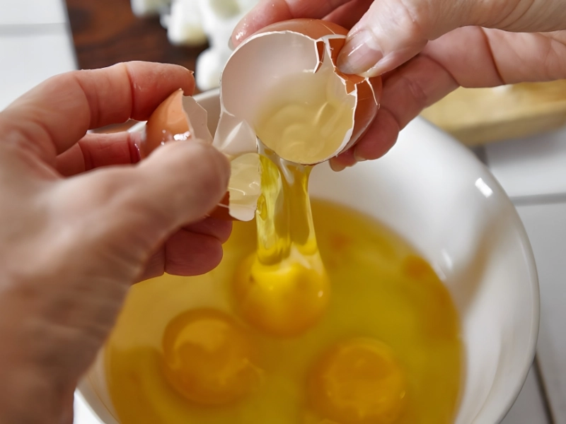 Butter hat einen Fettgehalt von etwa 80 %, Eier hingegen deutlich weniger. Daher sollte man beim Backen die Eier immer einzeln und vorsichtig unter die geschmolzene oder aufgeschlagene Butter rühren. So verbinden sich alle Zutaten in der Schüssel optimal zu einer homogenen Masse.