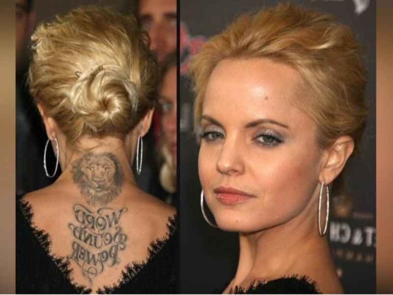 Mena Suvari’s back tattoo reads “Word Sound Power” beneath a lion, symbolizing courage and the transformative force of language.