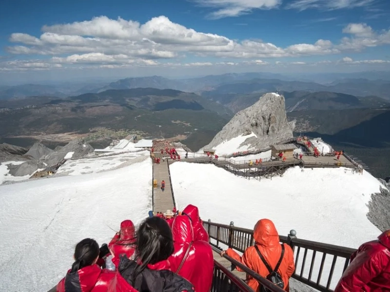 Le Point d'observation des Montagnes Enneigées offre d'excellentes vues sur les sommets enneigés voisins qui encadrent la vallée de Huanglong. Conçu en particulier pour les vues hivernales, ce site est aménagé pour capturer la grandeur des Alpes en toute saison. L'installation comprend des sections d'observation intérieures chauffées avec des baies vitrées du sol au plafond, permettant une observation confortable même par temps difficile. Des espaces dédiés à la photographie sur la plateforme sont conçus pour capturer le jeu de la lumière et des ombres sur les montagnes enneigées. Les jours clairs, cet endroit est parfait pour la photographie de paysage, car les visiteurs peuvent voir à des kilomètres à travers la chaîne de montagnes.