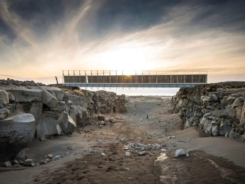 Traverser le Pont Entre les Continents offre aux visiteurs l'expérience unique de marcher entre les plaques tectoniques nord-américaine et eurasienne. Enjambant une faille visible dans le sol, ce pont piétonnier de 15 mètres matérialise la frontière séparant deux continents. Le site propose des expositions pédagogiques expliquant les mécanismes géologiques à l'origine de la séparation continue de ces plaques, d'environ deux centimètres par an. C'est un lieu très prisé pour des photos originales, et les visiteurs peuvent même obtenir un certificat attestant de leur traversée intercontinentale. Les plages de sable noir et les paysages volcaniques dramatiques des environs soulignent l'importance géologique du site. Le pont lui-même symbolise la situation unique de l'Islande, à la jonction géologique et culturelle de deux mondes.