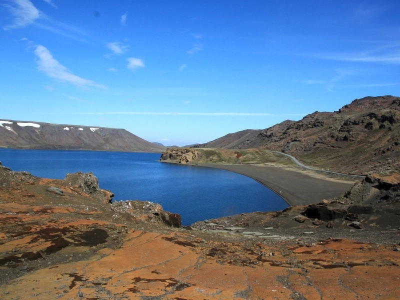 Plus grand lac de la péninsule de Reykjanes, le lac Kleifarvatn présente aux visiteurs un environnement naturel à la fois paisible et énigmatique. La profondeur du lac et ses plages de sable noir offrent un contraste saisissant avec les montagnes escarpées qui l'entourent. Des légendes locales évoquant une créature mythique habitant ses eaux ajoutent une touche de mystère. Plusieurs sentiers de randonnée longent ses rives, offrant différentes perspectives sur le lac et un accès à des sources chaudes cachées. L'activité géologique provoque des variations du niveau de l'eau, révélant des motifs côtiers intéressants. Par temps calme, les photographes apprécient particulièrement sa surface miroir, qui reflète parfaitement les paysages environnants.