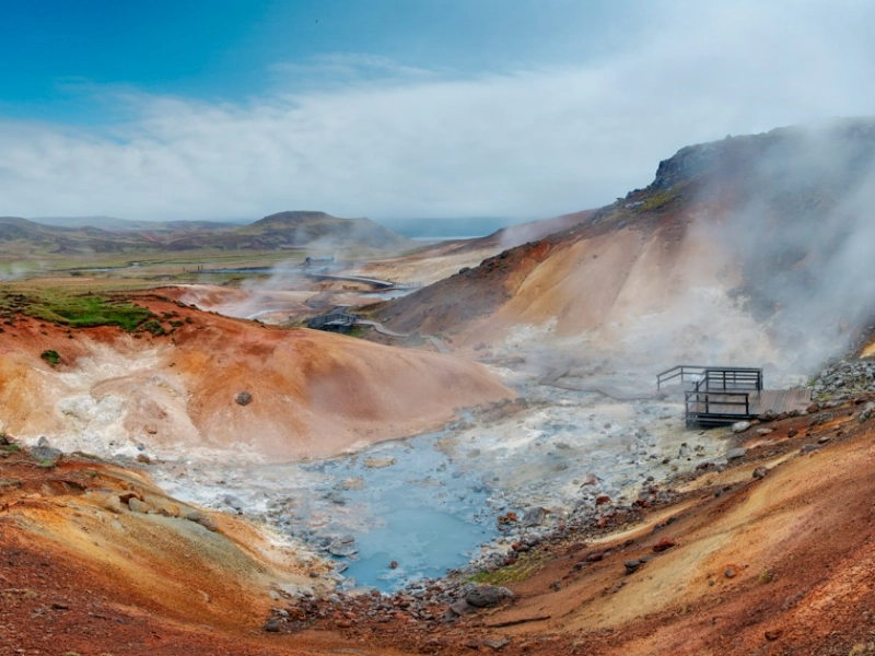 Le champ géothermal de Seltún présente aux visiteurs un spectacle vibrant de dépôts minéraux et de fumerolles, créant une scène presque surnaturelle. Des passerelles en bois guident les visiteurs sur un parcours sécurisé au milieu des marmites de boue bouillonnantes et des sources chaudes, où les températures peuvent atteindre 200 degrés Celsius. Différents dépôts minéraux et développements bactériens produisent des couleurs vives, des rouges profonds aux jaunes éclatants. Des panneaux d'information disséminés sur le site expliquent les processus chimiques à l'origine de ces teintes étonnantes et le contexte géologique de la région. Les plateformes d'observation surélevées offrent d'excellentes opportunités d'observer et de photographier l'activité géothermique à une distance raisonnable. Chaque visite est unique, car l'activité géothermique modifie constamment le paysage.