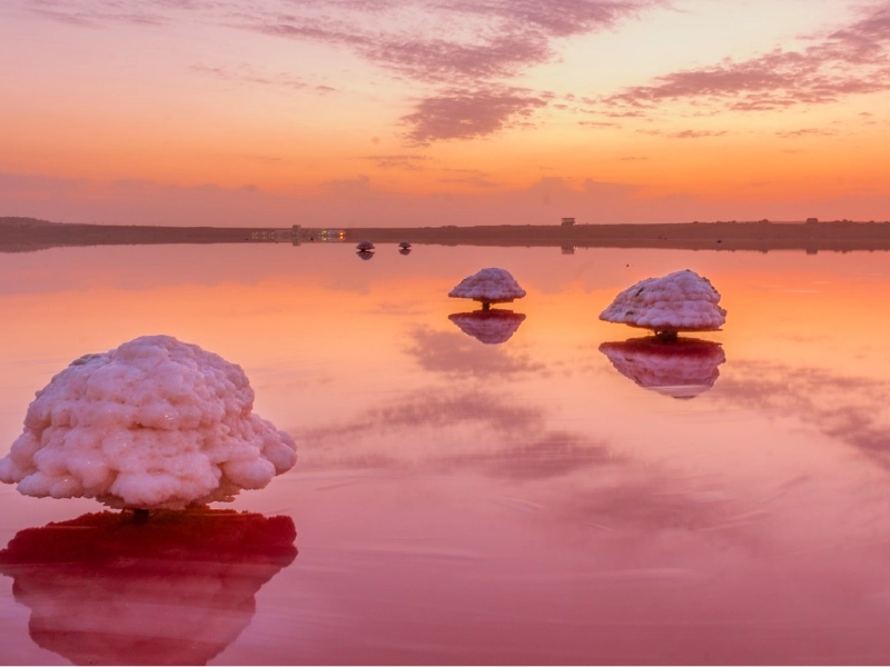 Près de Bakou, en Azerbaïdjan, le lac Masazir compte parmi les lacs roses les plus insolites de l'hémisphère oriental. Ce lac salé naturel prend une couleur rose unique à différentes saisons, notamment à la fin de l'été lorsque les taux d'évaporation sont les plus élevés. Le développement géologique du lac est marqué par la présence de dômes de sel souterrains et par l'histoire tectonique complexe de la région. La teinte rose est fournie par des archées halophiles spécifiques qui produisent de la bactériorhodopsine, un pigment violet-rose utilisé dans leur mécanisme de production d'énergie. Depuis l'Antiquité, la forte salinité du lac en a fait une source importante pour la production industrielle de sel ; la région environnante abrite des espèces végétales uniques tolérantes au sel qui se sont adaptées à cet environnement hostile.