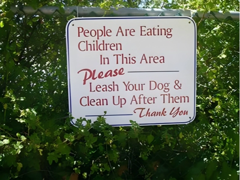 Pourquoi ne pas acheter un seul panneau pour indiquer les multiples possibilités de ce qui se passe dans ce quartier, au lieu d'en acheter plusieurs ? Et sur ce seul panneau, vous pourriez combiner tous les avertissements imaginables en une grande phrase confuse qui n'a aucun sens. Si vous souhaitez mélanger les dangers potentiels avec la peur et la retraite, c'est la méthode idéale pour garder votre quartier en sécurité.