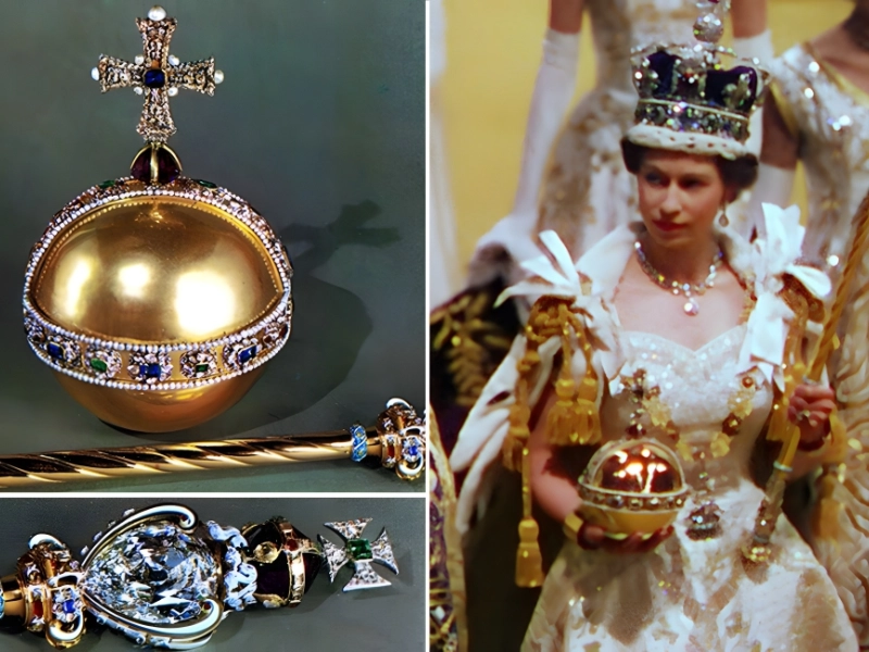 La Reine porta célèbre le Sceptre du Souverain lors de son couronnement en juin 1953. Une énorme pierre en forme de goutte, d'un poids incroyable de 530,2 carats, surmonte la tige dorée. Cette pierre est appelée l'Étoile d'Afrique ou diamant Cullinan, et elle brille effectivement comme une étoile.