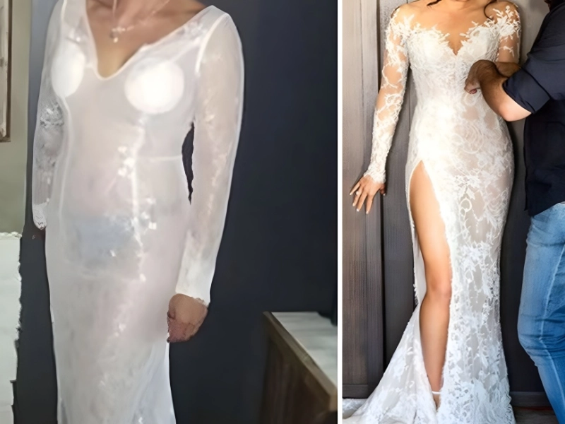 Nous pouvons tous convenir que cette robe est superbe sur le mannequin, même si ce n'est pas le type de robe que vous achèteriez personnellement. Il est compréhensible que des futures mariées veuillent l'acquérir à un prix bien inférieur. Cependant, voilà ce qui arrive quand on essaie de prendre des raccourcis.