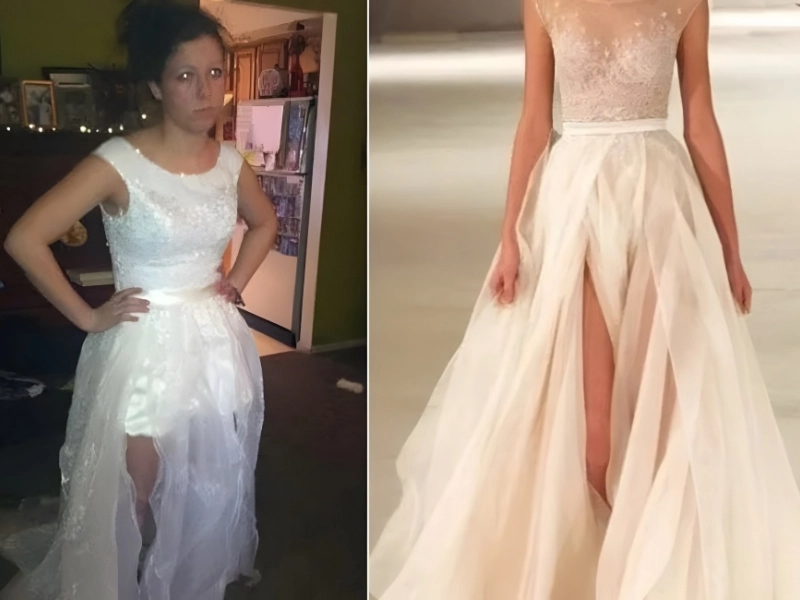Cette cliente a découvert la dure réalité en achetant une magnifique robe de soirée pêche qui, selon la promesse, allait attirer tous les regards. Ce qu'elle a reçu était un méli-mélo informe et déchiré, qui ne conviendrait même pas à la Fée Clochette.