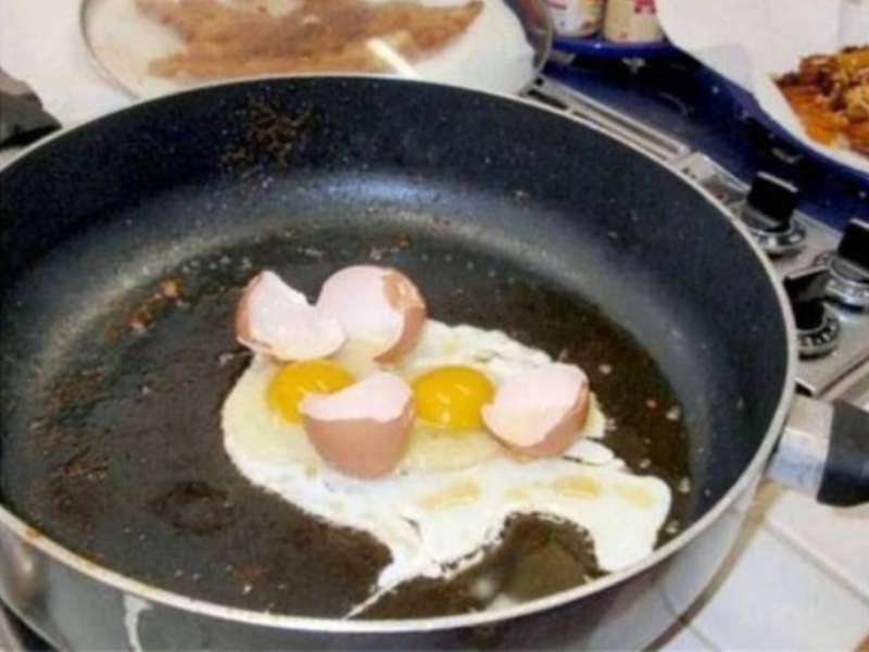 Le chef débutant tente ici sa première expérience avec des œufs brouillés.