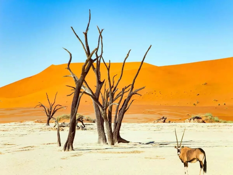 S'élevant jusqu'à 325 mètres de haut, les célèbres dunes rouges de Sossusvlei sont de silencieuses sentinelles au cœur du désert du Namib. Leur forte teneur en oxyde de fer, combinée à une formation millénaire par les vents dominants, leur confère des dégradés spectaculaires de rouge, d'orange et de rose. La lumière joue avec les ombres tout au long de la journée, offrant un spectacle en perpétuel changement, particulièrement magique au lever et au coucher du soleil lorsque les dunes semblent irradier de l'intérieur. Les visiteurs peuvent gravir ces structures impressionnantes, notamment les dunes Big Daddy et Dune 45, très populaires. Le contraste entre les dunes écarlates et le ciel d'un bleu pur offre des opportunités photographiques idéales, tandis que la faune et la flore adaptées à cet environnement aride ajoutent une autre dimension à cet écosystème extraordinaire.