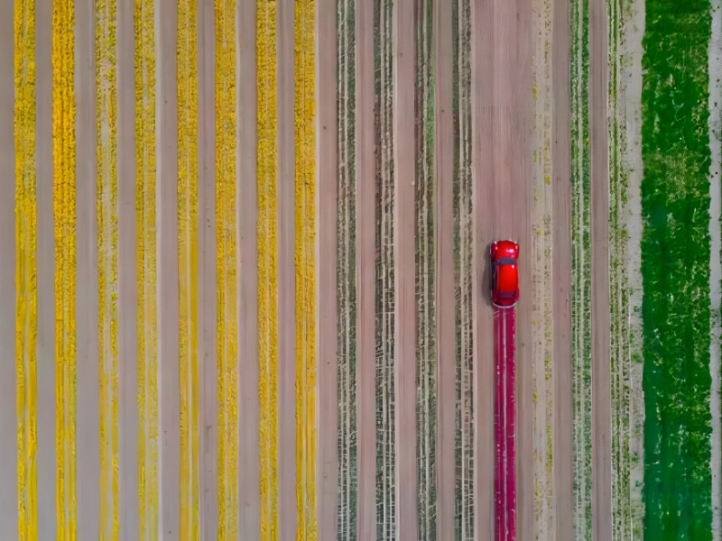La voiture rouge devant les plantes rouges crée l'illusion que ces couleurs – qui sont véritablement les enfants de la nature – sont ce qui subsiste après la création humaine. Que ce soit par les idées sous-jacentes ou par les images, cette photo participante aux Drone Awards est définitivement unique.
