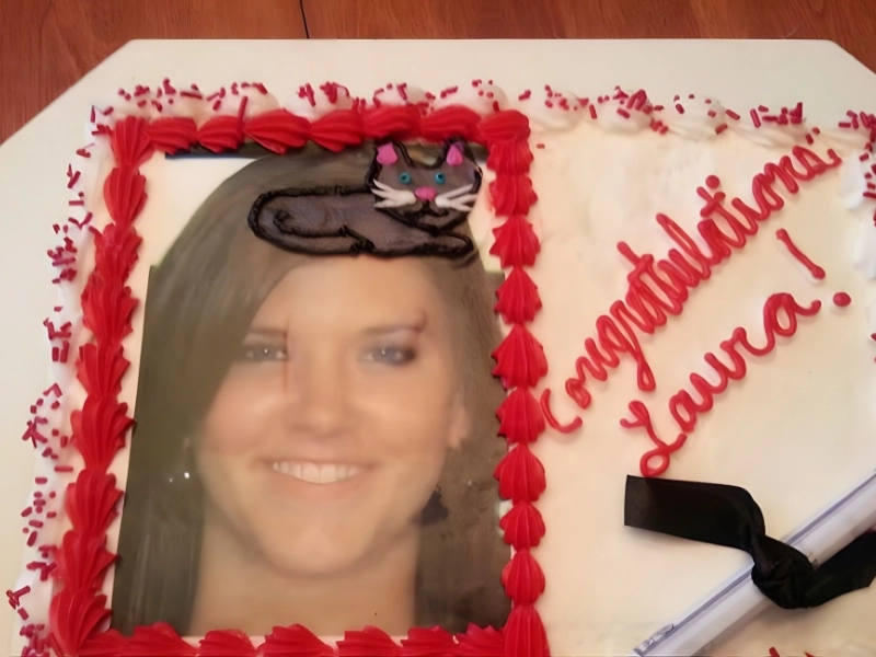 Le plan était que la boulangerie imprime une photo de Laura et ajoute une toque sur sa tête. Au lieu de cela, la boulangerie a dessiné un chat sur sa tête après avoir mal entendu. Étant donné qu'ils ont correctement identifié le parchemin de diplôme roulé dans le coin inférieur droit, l'erreur est inattendue. Néanmoins, la boulangerie mérite des éloges pour l'adorable illustration de chat.