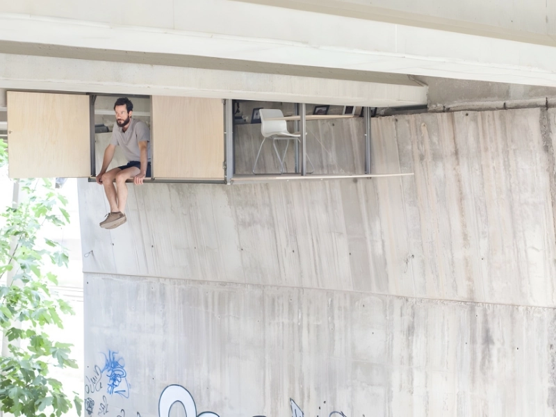 Designer autodidacte, Abellanas a utilisé une ingénierie astucieuse pour créer son petit « fort ». Il comprend un bureau, des chaises, des étagères et un lit. Il peut même replier les murs pour ouvrir ou fermer l'espace. Il est remarquable de trouver un studio amovible sous un pont, l'une des découvertes les plus inattendues.