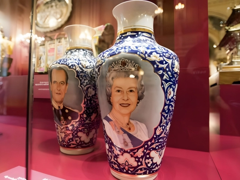 Le président de l'Ouzbékistan, Islam Karimov, a offert à la reine Elizabeth II et au prince Philip deux vases en porcelaine fleuris assortis. Cet ensemble aux couleurs bleu, blanc et or présentait des portraits en buste de la reine Elizabeth II et du prince Philip.