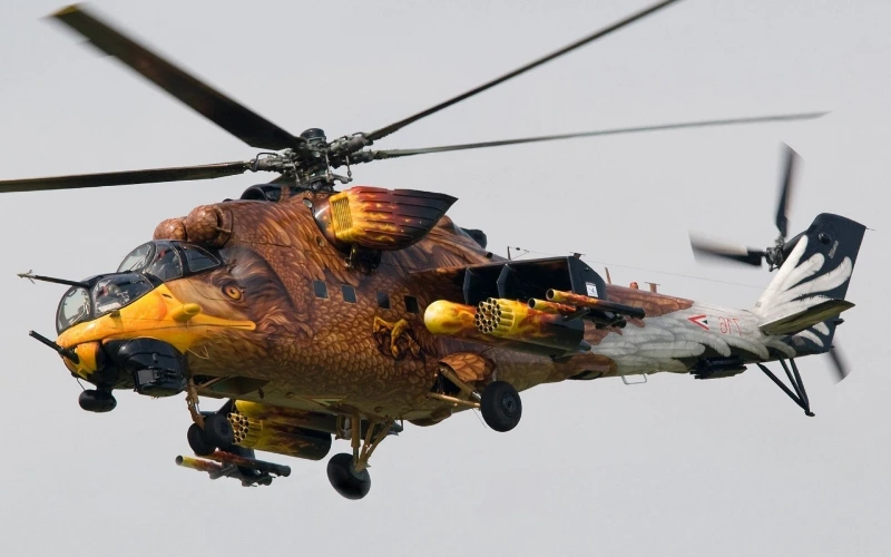 ハンガリー空軍のMi-24Vハインドヘリコプターは、カスタムの鷲塗装によって変貌を遂げています。このデザインは尾部から機首まで伸び、飛行中の猛禽の錯覚を生み出します。羽、目、くちばしの複雑な細部は並外れた芸術性を示します。地球色のトーンはその猛烈な外見を強化し、迷彩は戦術的利点も提供するかもしれません。この塗装は国家的誇りと軍用航空において可能な芸術性の両方を称えます。