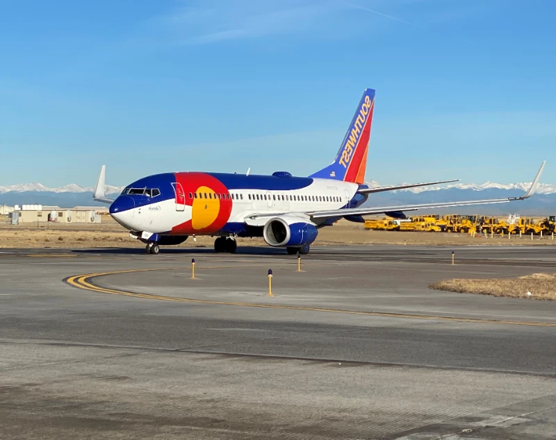 サウスウエスト航空のコロラドをテーマとした航空機は、地域ブランディングの模範です。この塗装はコロラド州旗を特徴とし、その大胆な赤い「C」、金色の円盤、青と白の縞模様が機体を優雅に包みます。このデザインはデンバーにおける航空会社の強い存在感を称え、地域の誇りに訴えます。特別な塗装はブランド認知度を高め、市場の絆を強化し、航空機に独自の個性を与え、地上と空中の両方で際立たせます。