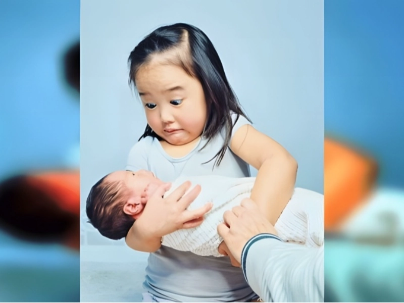 新生児の弟を抱く小さな女の子は、純粋無垢な愛らしさそのものです。この感動的な瞬間は、兄弟愛と無邪気さの本質を捉えています。お姉ちゃんの誇らしげな笑顔と喜びは、赤ちゃんの弟を優しく抱きしめる様子にはっきりと表れており、親が永遠に大切にするであろう心温まる光景を作り出しています。ここに写る絆は生涯続く友情の始まりに過ぎず、この写真は何年にもわたって笑顔をもたらす記憶を保存します。