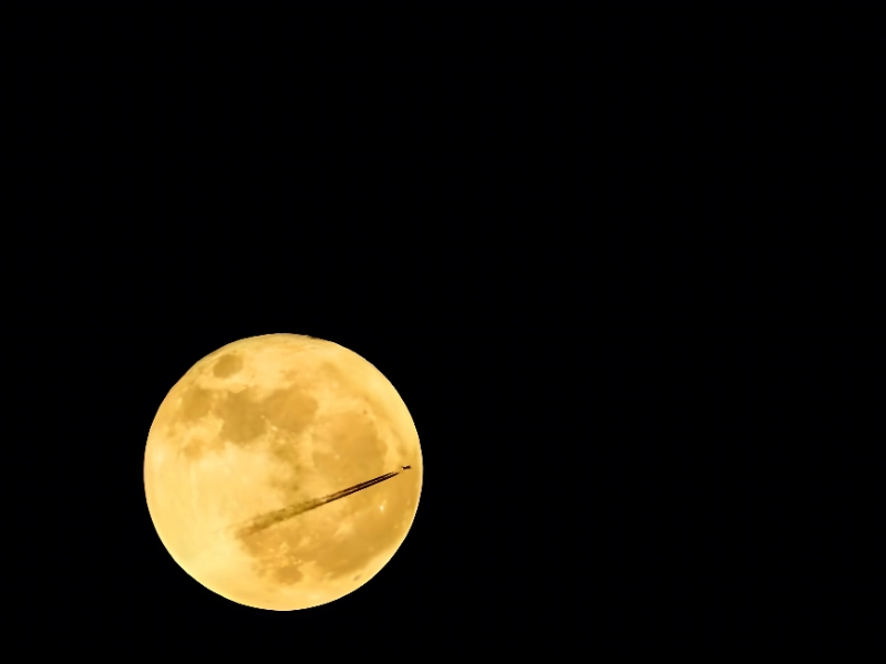 stock.adobe.com の息をのむ一枚は スーパームーンと飛行機が残した煙のような軌跡を組み合わせ 空想的な演出で月の存在感をさらに強調しています。巨大な月と儚い尾跡の対比が 物語的な情景を呼び覚まします。